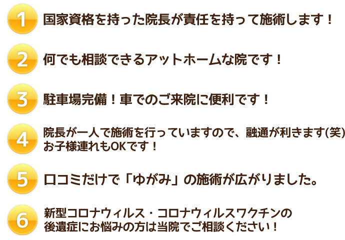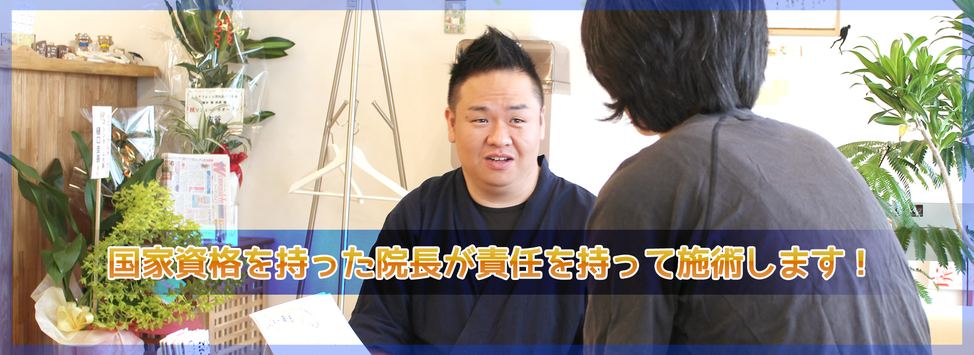 国家資格を持った院長があなたの相談役としてお悩みを解決いたします。当院は院長一人で施術を行っておりますので、色々と融通もききます(笑)